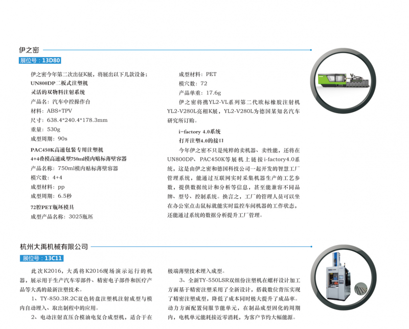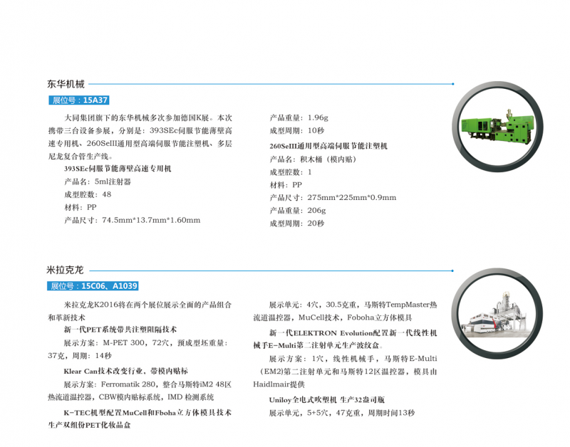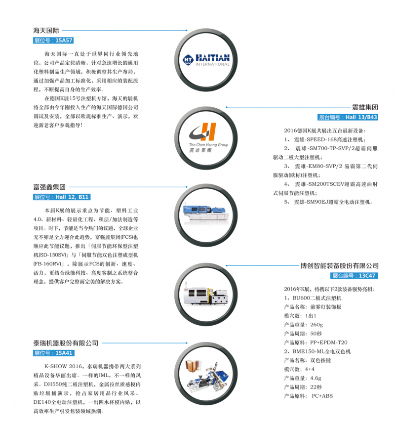 本屆盛會參展商來自59個國家,共3220家廠商參展。其中中國的參展商368家,匯集橡塑機械、設(shè)備、原料、輔助材料、半成品、工業(yè)組件及強化塑料等所有相關(guān)產(chǎn)品與服務(wù),共使用19個展館。本屆中國企業(yè)將重點展示節(jié)能、塑料工業(yè) 4.0、新材料、輕量化工程、自主研發(fā)、積層/加法制造等項目。