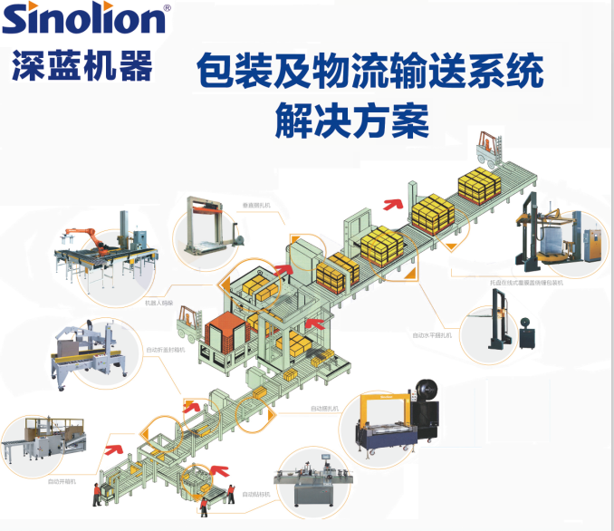 相對于傳統物流包裝從產品出廠后的包裝、運輸、裝卸、倉儲各個環節的分開管理模式,未來物流包裝勢必實現資源整合集成和整體系統優化。山東深藍機器股份有限公司以纏繞機、捆扎機和輸送設備為基礎產品,涵蓋倉儲、前后端包裝和輸送環節,為工業機器人應用研發各行業自動化包裝提供整體解決方案。