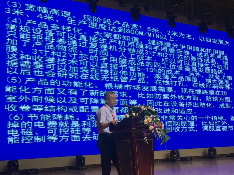 隨后上海交通大學教授張永明、北京化工大學教授苑會林、陶氏化學公司技術支持與開發助理經理馮繼昌博士、塑料薄膜行業專家謝新及近十家全國各地的代表性薄膜企業負責人先后分享了氟塑料薄膜、TPU 擠出流延薄膜、纏繞膜、PVC 保鮮膜、透氣膜、CPE 共擠流延膜、PVC 網布復合膜、高阻隔薄膜、PP 片材目前的市場行情與前景分析。