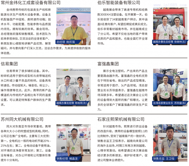中國塑企借助于越南市場的政策紅利、地緣和勞動力優(yōu)勢,投資熱情逐年升溫,業(yè)務(wù)范疇也在不斷擴大。《塑膠工業(yè)》記者通過走訪得知,參展商大部分攜帶了最新設(shè)備和工藝亮相,七成以上的中國企業(yè)都在越南有自己的代理公司,大部分企業(yè)表示對越南市場的增量需求和發(fā)展預(yù)期持看好態(tài)度。