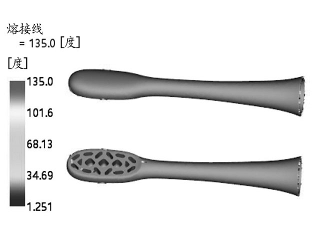 以電動牙刷頭外殼件為例,運用Moldflow軟件,進行冷、熱流道澆注方案注塑成型CAE分析,比較填充過程、V/P切換時壓力、熔接痕位置及體積收縮率等分析結果,綜合優選熱流道針閥進澆為最佳澆注方案
