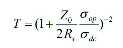 PEDOT:PSS薄膜的厚度越大,透光率更小,厚度的大小又與薄膜的方塊電阻有關,所以不能用單一個物理量來衡量薄膜的品質。為了更好的反應出薄膜的綜合性能,這里引入薄膜品質因數FoM。FoM物理意義是直流電導率(?dc)與光學電導率(?op)比值,表示符號?dc/?op。FoM可以綜合評價導電薄膜的性能,是評估透明導電薄膜的單一參數。FoM與導電薄膜透光率(T)和方塊電阻(Rs)的關系由(4)公式可得出[19,20]: