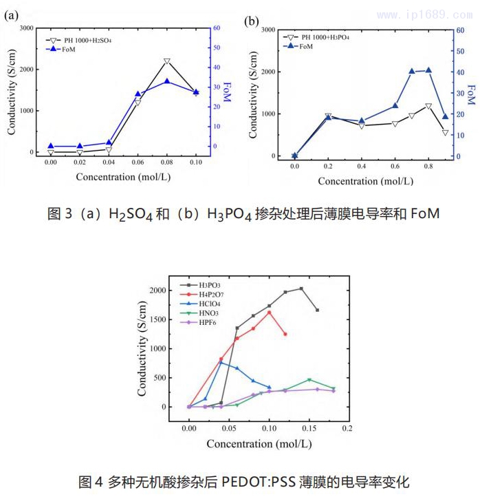 1)采用H2SO4摻雜試劑,將PEDOT:PSS薄膜的電導率從0.9S/cm提高到2216S/cm;采用H4P2O7摻雜試劑,將PEDOT:PSS薄膜的品質因數從0.03提高到40,提升了PEDOT:PSS薄膜商用價值。