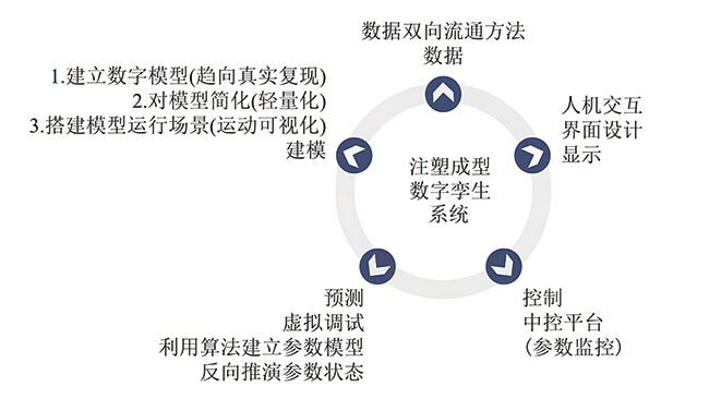 注塑成型數字孿生系統“五維”需求結構如圖4所示,其按步驟進行依次是建模、數據、顯示、控制和預測5個維度。