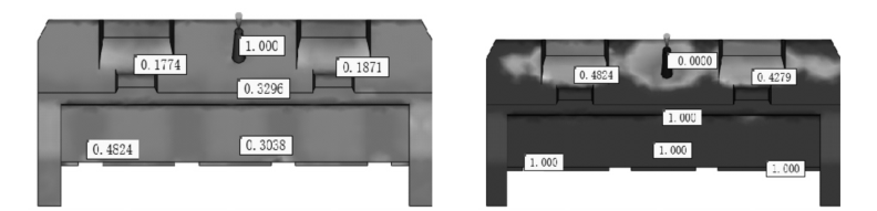 此質(zhì)量疏松度在一定程度上能反映制品的內(nèi)部疏松問題,當(dāng)質(zhì)量疏松度越大,則說明制品質(zhì)量不足,內(nèi)部收縮更大,出現(xiàn)縮孔的幾率也越高。根據(jù)分析結(jié)果,兩種方案的質(zhì)量數(shù)據(jù)如下表2。