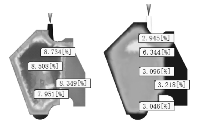 制品體積收縮情況如下圖3。從圖中可得,對于冷澆口方案,在制品壁厚部位,中間大面積的收縮率為8%左右,而對于熱澆口方案,只有中間小面積收縮率為6%,大部分在3%~ 4% 左右,整體更低。所以熱澆口方案的體積收縮情況也得到了明顯的改善。