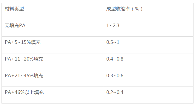 工程師告訴我們,玻纖加入量越多,尼龍樹脂的成型收縮率越小。但是玻纖加多了會造成表面浮纖、相容性差等后果,一般加30%效果相對較好。下表是一份經(jīng)驗得到的“玻纖-成型收縮率”表:
