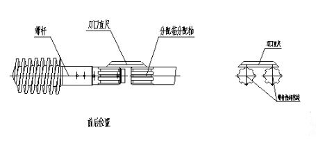 12) 測量機筒螺桿總間隙:將左右兩根螺桿(未裝墊片)往分配箱方向推至底部頂死, 將百分表置于機筒小端,把探針頭放在任意一根螺桿頭部后把表位調整至零位。同時在下料口處撬動左右螺桿往機頭方向頂死, 然后在百分表上讀出表顯數值C(此值為螺桿在機筒內的最大竄動量)。