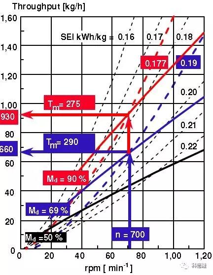 這種關(guān)系[8]的一個例子可在圖4中發(fā)現(xiàn)。圖4中顯示3種比扭矩機型產(chǎn)能對于螺桿轉(zhuǎn)速的曲線關(guān)系。SEI同樣作為參數(shù)因子。此數(shù)據(jù)來源于在ZSK 58 Mc (Do/Di = 1.55, torque= 1250 N-m/shaft, PVF = 11.3)上加工ABS 接枝共聚物(Acrylonitrile-Butadiene-Styrene)。69%和90%的2個曲線比較了在90%扭矩運行下在低扭矩機型ZSK 58 SuperCompounder (Sc) (Do/Di = 1.55, 960 Nm/ shaft, PVF 8.7)和在Mc (1250 N-m/shaft)上的情況。此2款機型有著30%的扭矩差距。對于此例,選擇了一個恒定的轉(zhuǎn)速700rpm。在69%扭矩曲線上(在960 Nm芯軸擠出機上90%扭矩運行),產(chǎn)能在660kg/h,SEI在0.19kw-h/kg,熔溫為290°C。提高產(chǎn)能到90%扭矩曲線,可發(fā)現(xiàn)SEI從0.19降低到0.177kw-h/kg。產(chǎn)能有40%的提高,到930kg/hr,不僅僅是預(yù)計的30%的提高。同時熔溫也降低了15°C到275°C。這尤其有利于熱和剪切敏感物料。它們可以運行在高產(chǎn)能之下,同時有著較低的熔溫。