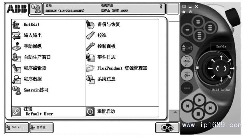 ScreenMaker是RobotStudio仿真軟件下用來創建用戶自定義界面的工具。使用該工具可創建自定義的操作員界面,編譯完成后可在示教器下監控工業機器人的運行位置、生產產品的數量、生產狀態等,使用自定義的操作員界面在工廠實地能簡化機器人系統操作,操作員界面能在正確的時間以正確的格式將正確的信息顯示給用戶。ScreenMaker簡單易學,使用ScreenMaker工具無需學習Vi-sualStudio開發環境和.NET編輯,也可創建自定義的示教器圖形界面。本論文中開發的圖形化示教器界面如圖1所示。