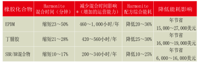 在所有情況下,12個含Harmonite的復合物表現出明顯縮短的混合周期和較低的綜合能耗(表2)。結合其流變儀測試研究數據,門尼燒焦時間和物理性質,實驗室得出結論,Harmonite在復合物中有著塑化作用。