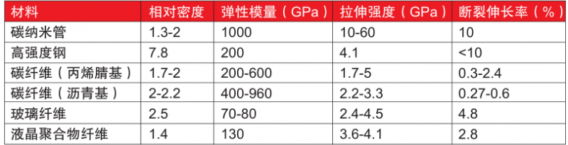 碳納米管是一種理想的一維模型材料,巨大的長徑比使其具有類似碳纖維的性能,即高強度、高模量。其重量為鋼的1/6,強度為鋼的100倍,比強度為鋼的600倍,具體見表2所示。