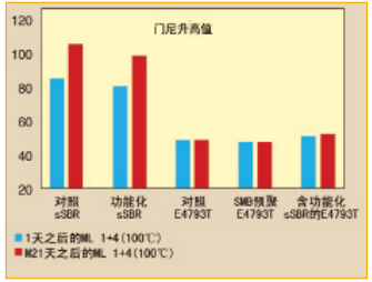 在填料網(wǎng)絡(luò)中,未硫化化合物的再團(tuán)聚和隨之而來(lái)的門尼上升,通常在貯存條件下會(huì)增加門尼值。我們?cè)?1天后測(cè)試了化合物的門尼,發(fā)現(xiàn)SMB產(chǎn)品非常穩(wěn)定,不存在任何上述的問(wèn)題。而干混化合物的門尼值有很大的增加(圖1)。