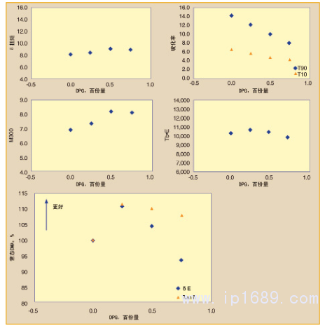 隨著DPG的增加,對(duì)焦燒安全性(T10)和佩恩效應(yīng)(δE′)有負(fù)面影響(圖3)。Tanδ(RR)也有類似的趨勢(shì)。重要的是要注意到,有來(lái)自歐盟REACH法規(guī)淘汰此產(chǎn)品的使用的壓力。