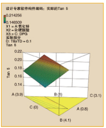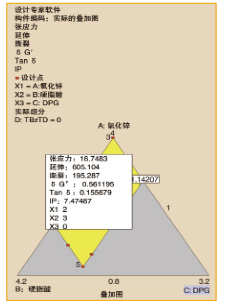 假設(shè)我們?cè)跊]有任何其它性能評(píng)判的情況下解決了Tan δ的最大化好處,那么我們就有了圖5所示的結(jié)果。原料含量為氧化鋅2份,硬脂酸3份,DPG 0份。用0.865的可靠性因子預(yù)測(cè),可以很容易地通過(guò)快速?gòu)?fù)合混合來(lái)驗(yàn)證該解決方案。