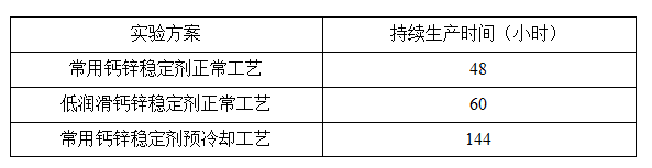 采用相同的配方,采用不同的鈣鋅穩(wěn)定劑,一種為常用鈣鋅穩(wěn)定劑,一種為穩(wěn)定劑廠家特制的低潤滑鈣鋅穩(wěn)定劑,同時比較正常工藝與預冷卻工藝的不同時生產(chǎn)的持續(xù)時間。