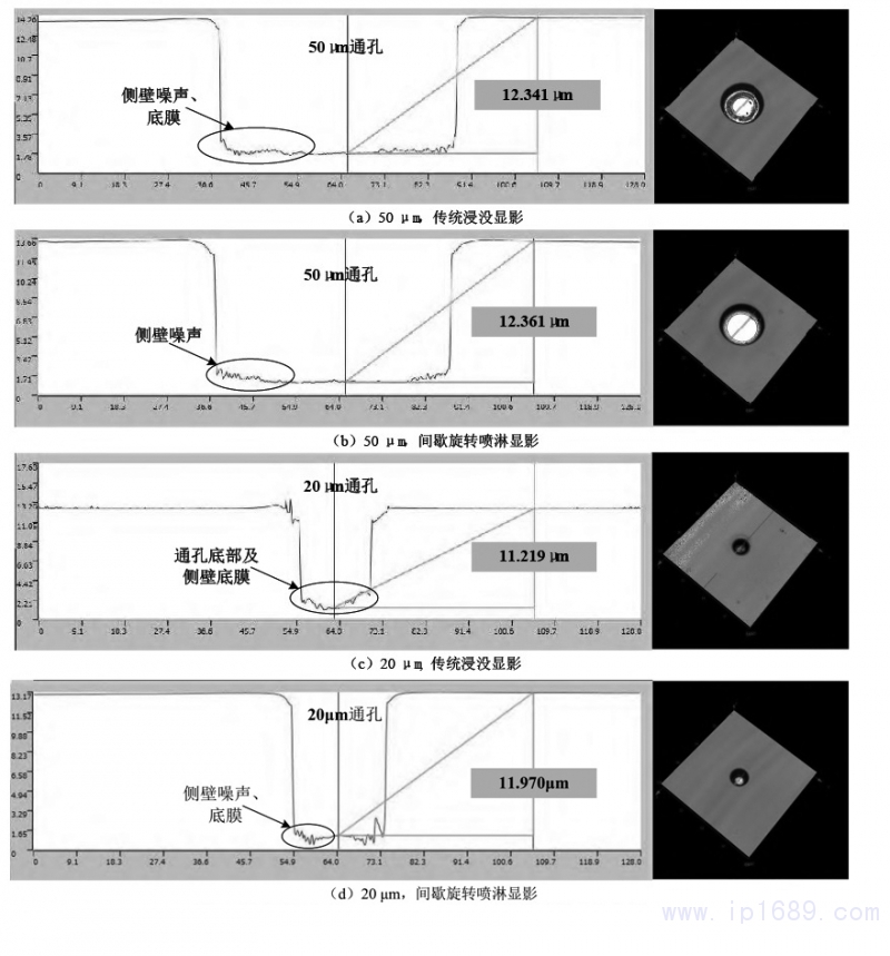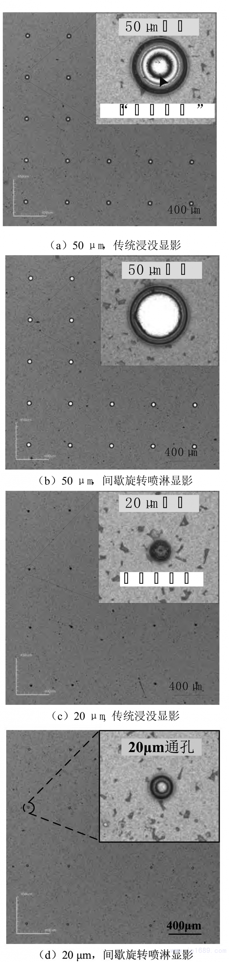 圖 3 不同顯影方式 20 和 50 μm 通孔的光學(xué)形貌圖片