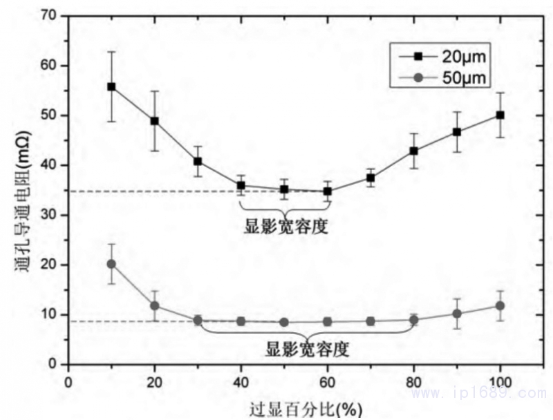 圖 7 不同過顯百分比的50和20μm 通孔導(dǎo)通電阻變化
