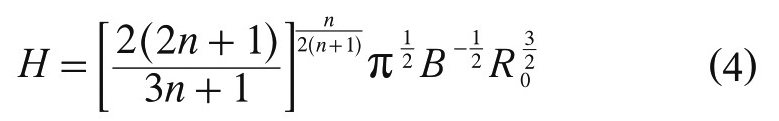 衣架式流道主要由歧管區(qū)、扇形區(qū)和模唇區(qū)3 部分組成。衣架式流道的設(shè)定參數(shù)為:(1)流延膜的目標(biāo)產(chǎn)量G(kg/h);(2)模具口模的設(shè)置半寬B(cm);(3)配方物料的密度ρ(g/cm3);(4)模具口模的設(shè)置厚度h(cm);(5)物料的非牛頓指數(shù)n。根據(jù)圖1與相關(guān)文獻(xiàn)[9],得到以下相關(guān)計(jì)算公式。