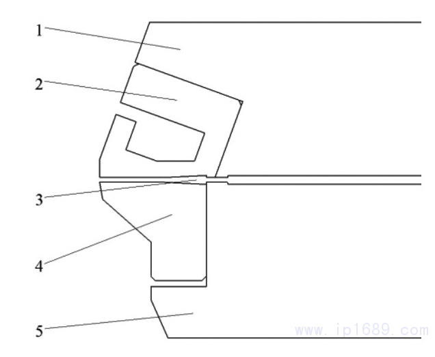 1-上模板;2-上模口;3-凹槽;4-下模口;5-下模板