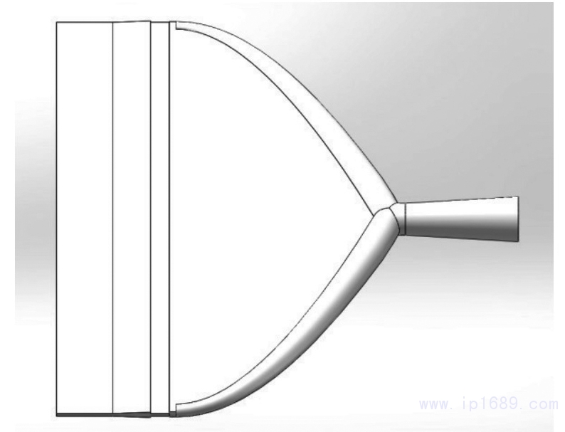 根據(jù)設(shè)計(jì)、計(jì)算與仿真獲得的結(jié)果建立流延模具流道的平面示意圖、流延模具流道的三維模型和流延模具的三維模型,如圖7、圖8、圖9所示。