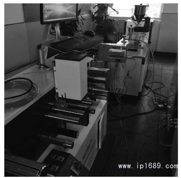 搭建流延模具實(shí)驗(yàn)裝置,如圖13所示,從流延模具擠出的流延膜溫度較高,由兩輥壓光機(jī)進(jìn)行壓光、冷卻定型,并可調(diào)整流延膜的厚度。