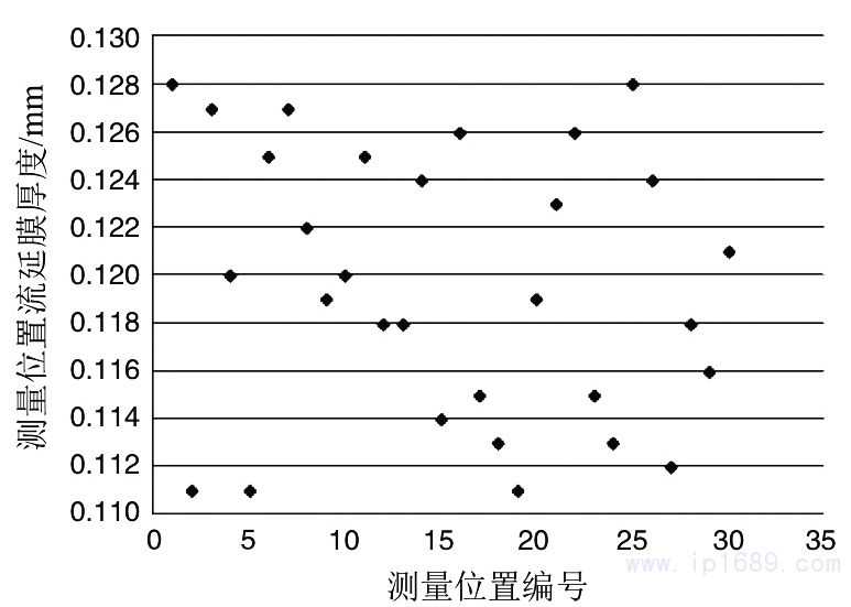 對實(shí)驗(yàn)得到的流延膜選取30個(gè)位置進(jìn)行厚度測量,得到流延膜厚度測量圖,如圖15所示,加工得到的流延膜厚度最高為0.128 mm,最低為0.111mm,其正負(fù)偏差小于8%,滿足流延膜厚度規(guī)范。