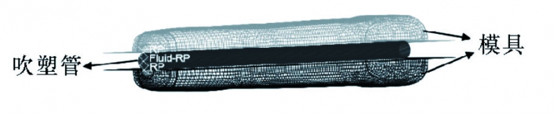 本文吹塑成型方法采用Abaqus/Explicit顯式算法進行求解。顯式算法求解速度快且收斂性良好[7]。吹塑成型網格模型如圖2所示,對模具凹模劃分網格,并把采用殼單元的吹塑管裝配于模具中間。