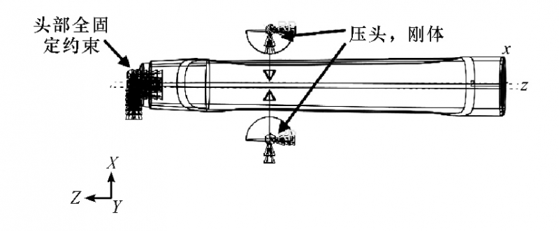 在吹塑模型中,模具均設置為離散剛體,僅吹塑管為變形體。設置兩個分析步第一個分析步為對圖2的上下凹模閉緊合模第二個分析步在約束吹塑管尾部的情況下進行吹塑成形。