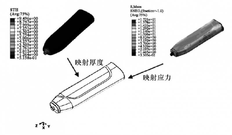 應用本文所提出的方法進行吹塑和結構聯合分析,還需如圖7示意將吹塑成型厚后的材料厚度和殘余應力映射至殼單元的塑料瓶模型上。