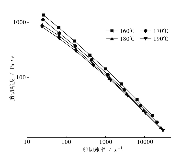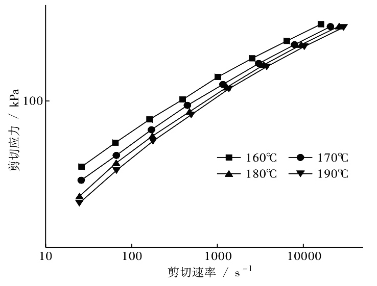 分別在160℃、170℃、180℃、190℃溫度下考察了LDPE2426H的剪切應(yīng)力和剪切粘度隨剪切速率的變化情況,結(jié)果見圖1,2。