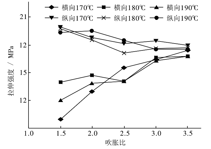 圖3加工溫度和吹脹比與拉伸強(qiáng)度的關(guān)系
