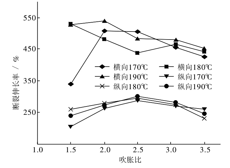 圖4加工溫度和吹脹比與斷裂伸長(zhǎng)率的關(guān)系