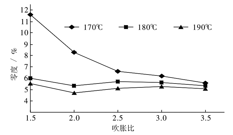 (3)對(duì)薄膜沖擊強(qiáng)度的影響。從圖5可見,加工溫度在170~190℃之間時(shí),吹脹比相同時(shí),隨著溫度的升高,膜的沖擊強(qiáng)度變化不明顯;但隨著吹脹比的加大,膜的沖擊強(qiáng)度增大,亦即膜的沖擊強(qiáng)度的變化對(duì)吹脹比更敏感。