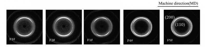 當片晶的法線方向無規(任意)取向時,f=0;當理想取向即片晶的法線方向與參考方向完全平行時,f=1;片晶的法線方向垂直參考方向時,f=-1/2。取向度f代表了片晶法線方向在薄膜平面內對于參考方向MD的擇優分布情況。