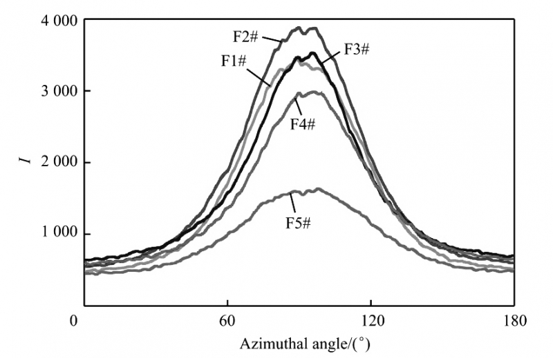 圖5為晶體長周期散射強度隨方位角變化的分布圖。從圖5可看出,五組試樣的方位角取向強度及半峰寬均有差異,因此可初步判定五組試樣的取向度是不同的,即片晶在薄膜平面內的分布有差異。