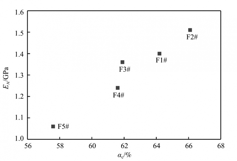薄膜平均楊氏模量與薄膜結晶度的關系見圖6。從圖6可看出,薄膜的結晶度越大,薄膜平均楊氏模量越大,薄膜的挺度越好。F3#與F4#的結晶度很接近,分別是61.9%和61.6%,但F3#的平均楊氏模量卻大于F4#。
