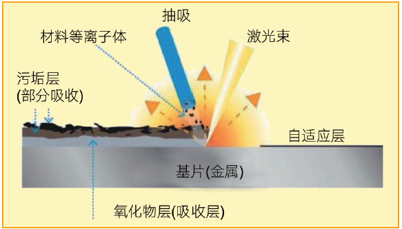 激光清洗是一種只清理污染物的無損處理方法,本體物質不會降解。當光束撞擊被清洗的材料時,它會產生一個高度壓縮的等離子體,通過產生沖擊波來松脫污垢。這個突然膨脹的體積會逐出污染物。快速脈沖(10 ns)防止發生熱影響(圖1)。