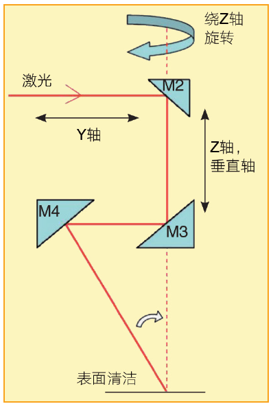 激光束由可移動的旋轉頭和平面鏡提供,允許最大反射1064毫微米。清洗頭沿兩個軸移動。清洗頭可以沿X軸移動575毫米和沿Y軸移動420毫米。在旋轉頭上,光束被重定向到模具(Z軸)。可移動頭允許激光束在Z軸附近約為15°角范圍到達模具(圖2)。