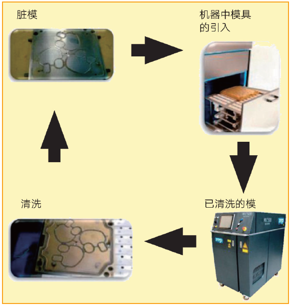 使用超聲波清洗也會對客戶的生產造成負面影響,因為該工藝耗時,清洗時需要拆卸一些模具。此外,這個過程僅能用于已冷卻的模具。只有在模具冷卻、清洗、再次加熱后才能重新啟動新一輪的生產。