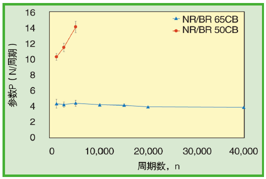 圖7、使用文中描述的條件,NR/BR 65CB和 NR/BR 50CB化合物撞擊周期數對P的影響