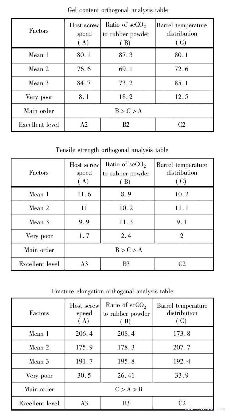 2.3.3 再生工藝條件確定:通過對正交實驗得到的數據進行正交分析,得到凝膠含量、拉伸強度、拉斷伸長率的正交分析表如Tab. 6所示。由表可以看出,超臨界流體與廢舊膠粉的質量比對再生程度的影響最大,機筒溫度次之,螺桿轉速最低,具有最佳再生效果的工藝條件是A2B2C2;超臨界流體含量增加有利于拉伸強度的提高,并且超臨界流體與膠粉的質量比對拉伸強度的影響最大,機筒溫度次之,螺桿轉速影響最小。在A3B3C2條件下,膠料具有最佳的拉伸強度;對斷裂伸長率的影響最大的是機筒溫度,其次為螺桿轉速,質量比最弱。但是具有最佳斷裂伸長率的工藝條件與最佳拉伸強度的工藝條件一致。
