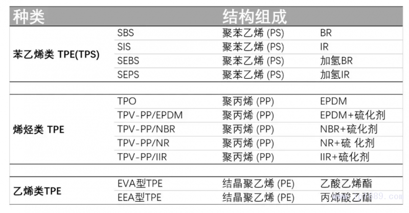 TPE主要由二部分組成,一是塑料,作為連續(xù)相,二是橡膠作為分散相。通常橡膠需要與軟化油或增塑劑與之配合。硫化劑和一些輔助助劑也是必不可少的。另外為了降低成本或者提高某方面的性能,一些無機(jī)填料也會被填加。根據(jù)材料組成可分為:苯乙烯類(SBS、SIS、SEBS、SEPS)、烯烴類(TP0、TPV)、雙烯類(TPB、TPI)、氯乙烯類(TPVC、TCPE)、氨酯類(TPU)、酯類(TPEE)、酰胺類(TPAE)、有機(jī)氟類(TPF)、有機(jī)硅類和乙烯類等,幾乎涵蓋了現(xiàn)在合成橡膠與合成樹脂的所有領(lǐng)域。下面列舉幾種常見的TPE的組成成分。