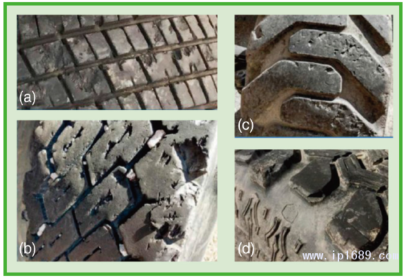 圖1、對胎面膠不同程度的崩花和切割損傷的示例:全鋼/重型載重汽車輪胎(a)和(b);工程車輛輪胎(c);泥濘地形輕型卡車輪胎(d)