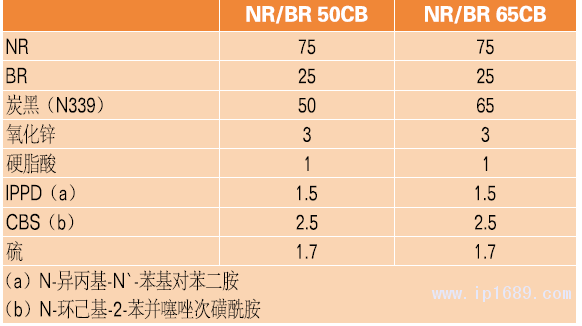 本研究中使用的聚合物為天然橡膠(NR:馬來西亞恒粘膠SMR CV60標(biāo)準(zhǔn)膠)和高順丁二烯橡膠(BR:來自阿朗新科的BUNA CB24釹系稀土順丁橡膠)。補強填料為N339級炭黑(CB)。所有其他成分均是橡膠級化學(xué)品。橡膠配方在表1中給出。