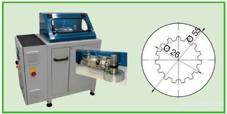 圖2、儀表化的崩花和切割分析儀(ICCA)的照片顯示撞擊裝置和樣品的展開圖(左)和55毫米外徑和13毫米厚度的橡膠樣品幾何圖(右)