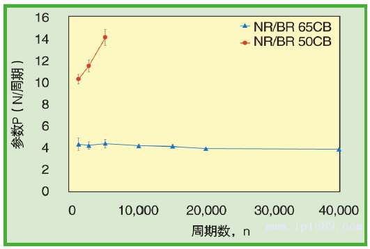 圖7、使用文中描述的條件,NR/BR 65CB和 NR/BR 50CB化合物撞擊周期數(shù)對P的影響
