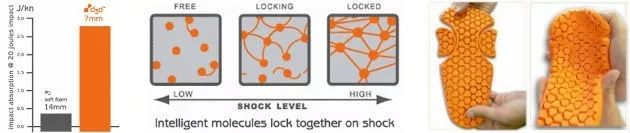 最后,讓我們回顧一種吸能泡沫復合智能高分子材料.英國D3O公司有一種專利的吸能凝膠,它是一種以復雜的彈性體化合物為基礎的剪切增稠材料。