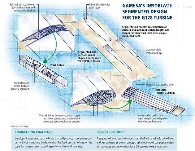 Gamesa通過一種設(shè)計(jì)方案解決了這一挑戰(zhàn),設(shè)計(jì)了一個(gè)用可靠的螺栓連接和專有結(jié)構(gòu)概念組裝的分段葉片,使用了優(yōu)化的復(fù)合材料、工藝和自動(dòng)化,使其重量減少了25%。