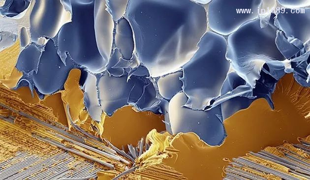 KydN-PET泡沫(藍(lán)色)和BaxdODO環(huán)氧體系(棕色)的顯微圖